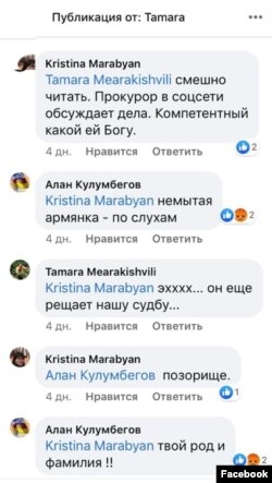 თამარ მეარაყიშვილმა უკვე მიმართა დე ფაქტო გენერალურ პროკურატურას განცხადებით, რომ მოიკვლიონ მათი თანამშრომლის ქცევა და დანაშაულის ნიშნები, რომლებიც მის მიმართ იკვეთება. განცხადებაში აღნიშნულია, რომ პროკურორი კულუმბეგოვი სამუშაო საათებში საპროკურორო ეთიკის დარღვევით იყენებს სიძულვილის ენას და ცილისმწამებლურ გამონათქვამებს, შეურაცხყოფს მის ეროვნულ კუთვნილებას და აქტიურ სამოქალაქო პოზიციას. მეარაყიშვილს დე ფაქტო გენერალური პროკურატურიდან აცნობეს, რომ პასუხს გასცემენ საქმის მოკვლევის შემდეგ, ერთ თვეში.
