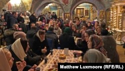 ხოლო მისი მრავალრიცხოვანი, უჩვეულოდ ახალგაზრდა მრევლი არ დაშლილა. მას შემდეგ, რაც მაგიდები შემოიტანეს და ძველებურ ხატებსა და ოქროს შანდლებს შორის ჩაამწკრივეს, ერთმანეთში საუბარიც დაიწყო. სქელი პალტოები გაიხადეს და ტელეფონები მოიმარჯვეს. ერთმანეთის ნომრებს იწერდნენ, ერთმანეთის მზერას ეძებდნენ, ან გაურბოდნენ. და ღვთისმოსავთა ამაღლებული განწყობა ფლირტმა და კისკისმა შეცვალა.