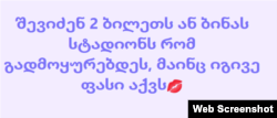 „მინდა სტადიონზე ვთხოვო ხელი ჩემს შეყვარებულს, მჭირდება 2 ბილეთი. ვინც მაჩუქებს, ქორწილში დავპატიჟებ“.