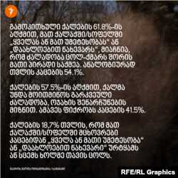 ქალების დაახლოებით 35% კი თვლის, რომ ქალს უნდა რცხვენოდეს ან უხერხულად უნდა იგრძნოს თავი ვინმესთან საუბრისას იმაზე, რომ ქმარი მას ფიზიკურ ზიანს აყენებს ან აკონტროლებს.