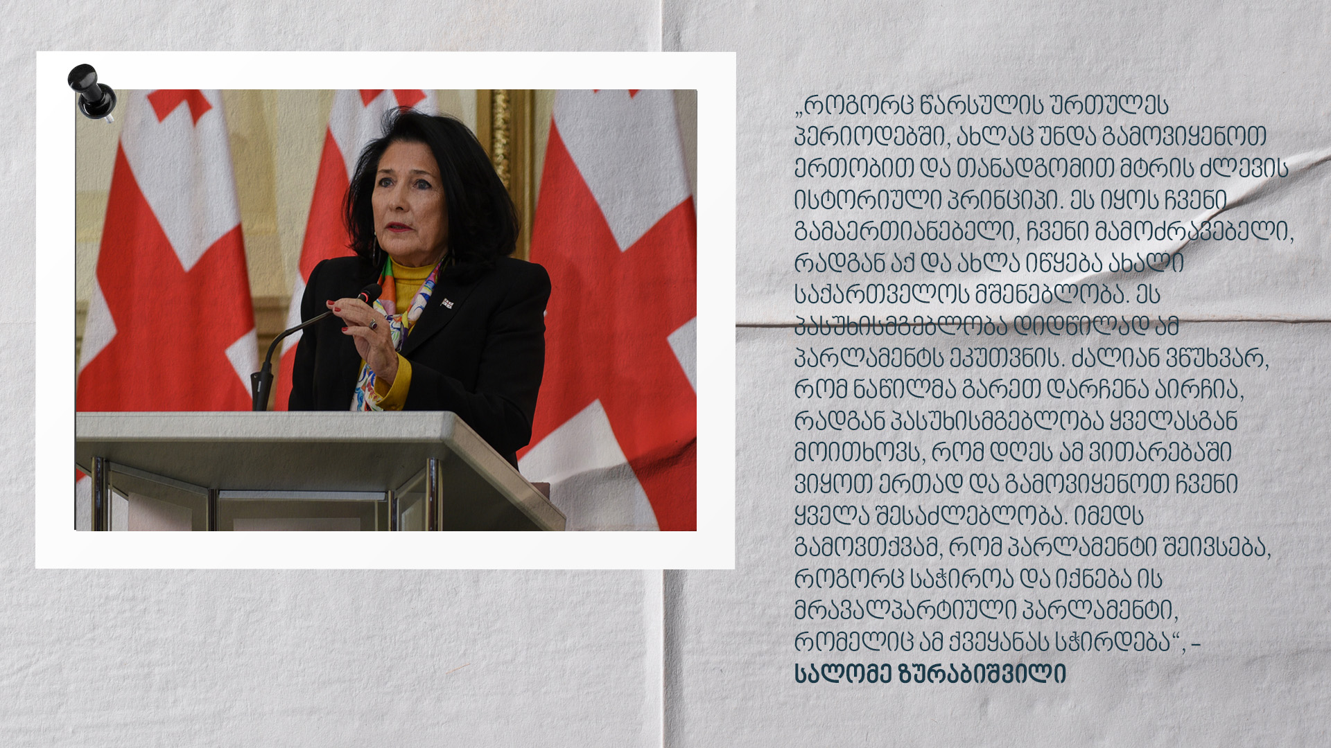 „ჩვენი ქვეყანა დემოკრატიულობისა და განვითარების გზაზე შეუფერხებელ სვლას აგრძელებს“. 31 ოქტომბრის საპარლამენტო არჩევნებით ქართულმა საზოგადოებამ დაამარცხა ნიჰილიზმი და საკუთარ თავს დაუმტკიცა, რომ პოსტსაბჭოთა ეპოქა საქართველოში სრულდება“ - სალომე ზურაბიშვილი