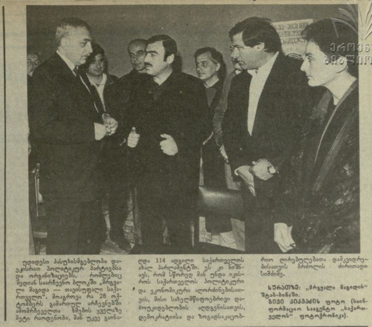 „გაგვახარა ჩვენი ერის ასეთმა გამოღვიძებამ, ასეთმა პოლიტიკურმა სიმწიფემ და დარაზმულობამ, მაგრამ ამავე დროს ისიც უნდა აღინიშნოს, რომ ჩვენი მოწინააღმდეგენი მიმართავდნენ ყოვლად უღირს ხერხებს, უხეშად არღვევდნენ და ახლაც არღვევენ კანონს: ყოველნაირად ცდილობდნენ ხელოვნური ზემოქმედება მოეხდინათ არჩევნებზე, აშინებდნენ არაქართულ მოსახლეობას „მრგვალი მაგიდით“ და ამას სჩადიოდნენ არა მარტო კომუნისტები, არამედ სხვა ბლოკების წარმომადგენლებიც. ავრცელებდნენ ხმებს, რომ „მრგვალი მაგიდა“ გაასახლებდა მათ საქართველოდან, მოუწყობდა გენოციდს და ა.შ.“