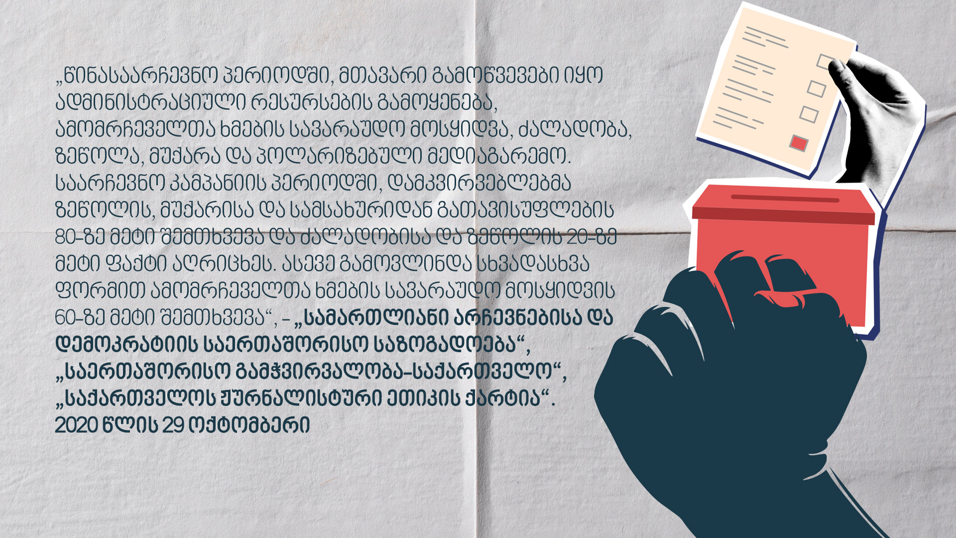 4 ნოემბერს გამოქვეყნებულ ერთობლივ განცხადებაში, 26-მა ადგილობრივმა არასამთავრობო ორგანიზაციამ [„საერთაშორისო გამჭვირვალობა საქართველო“, „ახალგაზრდა იურისტთა ასოციაცია“, „სამართლიანი არჩევნებისა და დემოკრატიის საერთაშორისო საზოგადოება“, „საქართველოს დემოკრატიული ინიციატივა“ და სხვ.] განაცხადა, რომ 2020 წლის საპარლამენტო არჩევნები „ქართული ოცნების“ ხელისუფლების პირობებში ჩატარებულ არჩევნებს შორის ყველაზე ნაკლებად დემოკრატიული და თავისუფალი იყო: