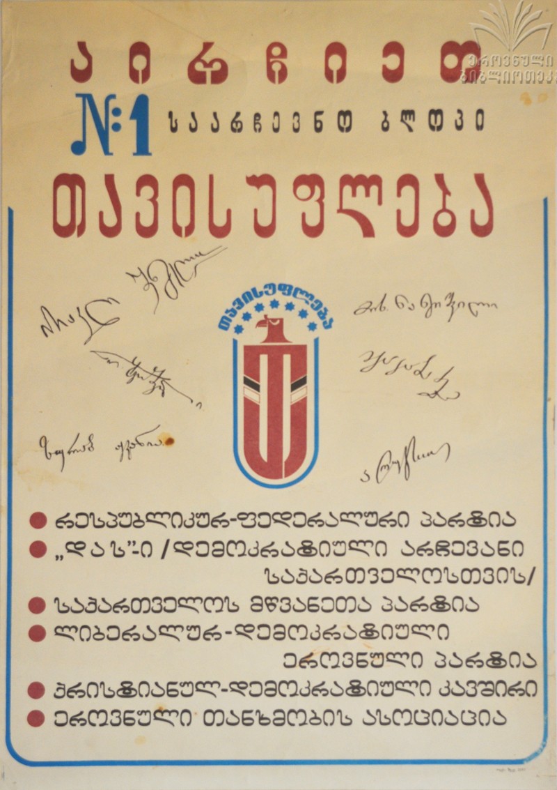 „საქართველოში პირველად უნდა გაიმართოს მრავალპარტიული არჩევნები! ვისი გამარჯვებაა არჩევნებში სასურველი - რუსთაველის საზოგადოების? სახალხო ფრონტის? მრგვალი მაგიდის? მწვანეების? ფედერალური პარტიის? დასის? არც ერთის! მრავალპარტიულ არჩევნებში უნდა გაიმარჯვოს საქართველოს ეროვნულმა მოძრაობამ! ეს გამარჯვება ნიშნავს უზენაესი საბჭოს გარდაქმნას ჭეშმარიტ პარლამენტად და საქართველოს პოლიტიკური დამოუკიდებლობის აღდგენის რეალურ არგუმენტს.