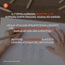 6-17 წლის ბავშვების მხოლოდ 12.2% ახერხებს იაროს მუსიკაზე, ცეკვასა და ხატვაზე. ამგვარ კლასებში მონაწილეობის სურვილი აქვს თითქმის ორჯერ მეტ ბავშვს (23.9%), მაგრამ არ აქვს ამის საშუალება.