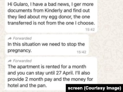 რადიო თავისუფლებამ მოიპოვა ე.წ. სქრინიც, სადაც სუროგატი დედა წერს, რომ მან მოახერხა ბიოლოგიურ მშობლებთან გასაუბრება, რომლებმაც უთხრეს, რომ მომსახურების სრული თანხა უკვე ჩარიცხულია კომპანიის ანგარიშზე: