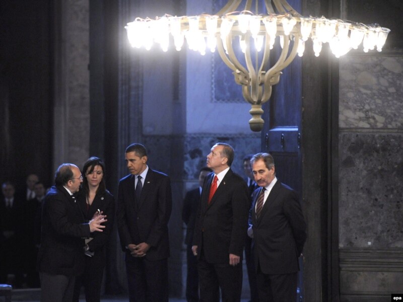 აშშ-ის პრეზიდენტი ბრაკ ობამა და თურქეთის პრემიერ-მინისტრი რეჯეპ ტაიპ ერდოანი აია სოფიას ტაძარში