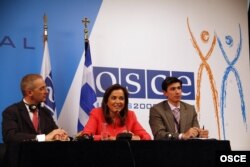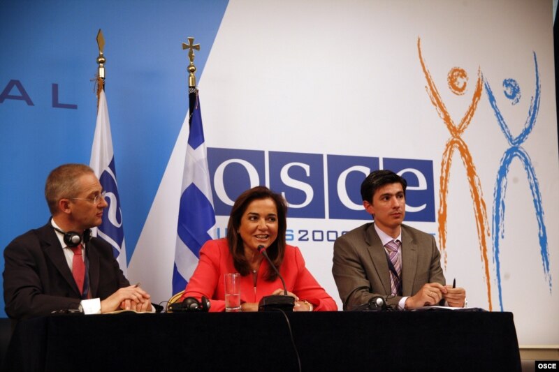 ეუთოს პრესმდივანი მარტინ ნესირკი (მარცხნივ), საბერძნეთის საგარეო საქმეთა მინისტრი დორა ბაკოიანისი და საგარეო უწყების პრესმდივანი გრიგორის დელავეკურასი კორფუზე გამართული პრესკონფერენციისას