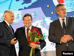 მარცხნიდან: ევროპარლამენტის პრეზიდენტი იეჟი ბუზეკი, ევროკომისიის თავმჯდომარე ჟოზე მანუელ ბაროზო, პოლონეთის პრეზიდენტი ბრონისლავ კომოროვსკი.
