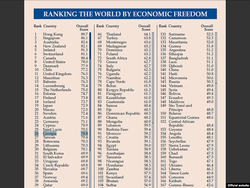მიმდინარე კვირაში ”ფრეიზერის ინსტიტუტმა” და ”ჰერიტიჯის ფონდმა” თითქმის ერთდროულად გამოაქვეყნეს მსოფლიოში ეკონომიკური თავისუფლების ინდექსი. ორივე კვლევის მიხედვით, საქართველომ საგრძნობლად წინ წაიწია და საუკეთესო ოცეულს მიუახლოვდა. ”ფრეიზერის” რეიტინგის მიხედვით, საქართველო 23-ე ადგილზეა, ხოლო ”ჰერიტიჯის” რეიტინგში - 26-ზე.
