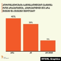 თუმცა, NDI-ს 2020 წლის ივნისის გამოკითხვით, კორონავირუსის ვაქცინის არსებობის შემთხვევაში მოსახლეობის 46 % არ აიცრებოდა. გამოკითხულთა 38 % აცრაზე თანახმაა, ხოლო 15 %-ს უჭირს პასუხის გაცემა. ფოკუსჯგუფთან ჩატარებულმა ინტერვიუებმა აჩვენა, რომ ქართველების უმეტესობა ზოგადად არ ეწინააღმდეგება ვაქცინაციას, თუმცა კვლევაში მონაწილეების ერთმა ნაწილმა თქვა, რომ „აცრა საჭირო აღარ იქნება, როცა პანდემიის საფრთხე გადაივლის”, სხვებმა კი არ დამალეს, რომ გადამწყვეტი მნიშვნელობა ვაქცინის წარმომავლობას ექნება.