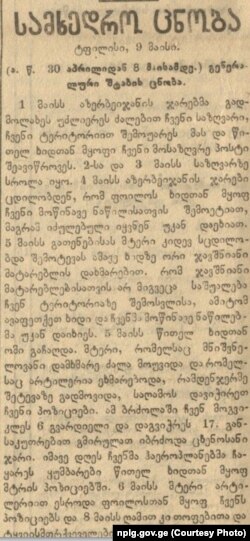 „1920 წლის მაისის 7-ს, ღამის 12 საათსა და 20 წუთზე, საქართველოს წარმომადგენელმა, დამფუძნებელი კრების წევრმა გრიგოლ ურატაძემ ხელი მოაწერა საზავო ხელშეკრულებას რუსეთსა და საქართველოს შორის“, - ეს ისტორიული ცნობა, ხელშეკრულების ძირითად მუხლებთან ერთად, 1920 წლის 11 მაისის „საქართველოს რესპუბლიკაში“ გამოქვეყნდა.
