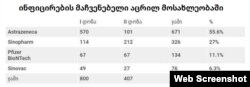 334 ათასზე მეტი აცრიდან იმუნიზაციის შემდგომი გართულების 607 შემთხვევაა დაფიქსირებული, მათგან მხოლოდ 101 (აცრების 0,03%) ჩაითვალა სერიოზულ გართულებად. მათგან 25-მა გაიარა სტაციონარული მკურნალობა, ხოლო 65-მა - ამბულატორიული.