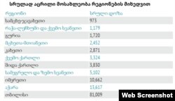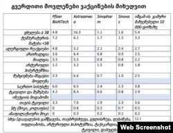 ყველაზე მეტი ადამიანი (ორჯერადად) თბილისშია აცრილი (81 ათასი), ყველაზე ნაკლები კი სამცხე-ჯავახეთში (973). სამცხე-ჯავახეთში ვაქცინაციის დაწყებიდან მესამე დღეს, ვაქცინის გაკეთებიდან რამდენიმე საათში ექიმი გარდაიცვალა - გარდაცვალების საბოლოო მიზეზი ჯერ დადგენილი არ არის.