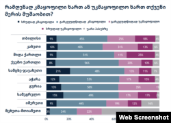 რაც შეეხება რეგიონების მიხედვით, ყველაზე მეტად კმაყოფილები მერის მუშაობით სამცხე-ჯავახეთში არიან (69%), ყველაზე ნაკლებად კმაყოფილები - მცხეთა-მთიანეთში (27%).
