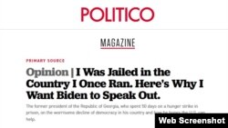გავლენიანმა ანალიტიკურმა ჟურნალმა POLITICO-მ 20 ნოემბერს გამოაქვეყნა საქართველოს ექს-პრეზიდენტის, მიხეილ სააკაშვილის მოსაზრება, სადაც ის აშშ-ის პრეზიდენტ ჯო ბაიდენსა და მის ადმინისტრაციას მოუწოდებს, შეასრულოს საქართველოს დემოკრატიის მხარდაჭერის პირობა და მხარი დაუჭიროს „მძიმე საფრთხის ქვეშ მყოფ ახალგაზრდა დემოკრატიას“.