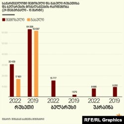 საქართველოს ხელისუფლება ამბობს, რომ ომის დაწყების შემდეგ უკრაინიდან და რუსეთიდან შემომსვლელთა რაოდენობა არ გაზრდილა, თუმცა გაიზარდა ნაკადი ბელარუსიდან. „თითქმის 10-ჯერ მეტია შემოსული ბელარუსის მოქალაქეები, განსხვავებით რუსეთის მოქალაქეებისგან“, - თქვა შინაგან საქმეთა მინისტრმა პარლამენტში გამოსვლისას და ერთმანეთს 2019 და 2022 წლების ანალოგიური პერიოდები შეადარა.