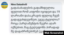 ნინო დათაშვილი რადიო თავისუფლებას ეუბნება, რომ მან ერთ-ერთი საჯარო პოსტის კომენტარებში ბექა ოდიშარია გააკრიტიკა და დაუწერა, რომ მან გადასახადების გადამხდელთა ფულით აიფონი იყიდა.