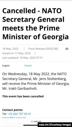 ნატოს ოფიციალურ ვებსაიტზე განახლდა ინფორმაცია საქართველოს პრემიერ-მინისტრისა და ნატოს გენერალური მდივნის დღეს დაგეგმილი შეხვედრის შესახებ. ბრიუსელის დროით 13:42 სთ-ზე განახლებული ინფორმაციით, შეხვედრა, რომელიც დღეს დილას გაუქმდა, გაიმართება. შეხვედრაზე არ გაკეთდება კომენტარები მედიისთვის. შეხვედრის ამსახველ ფოტო მასალას თავად ნატო გაავრცელებს.