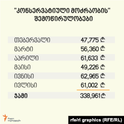 "კონსერვატიული მოძრაობა" "ალტ-ინფომ" პარტიად გასული წლის ბოლოს, 2021 წლის ნოემბერში დააფუძნა, შემოწირულებების მიღება კი 2022 წლის თებერვლიდან დაიწყო. 31 ივლისის ჩათვლით "კონსერვატიულ მოძრაობას" 339 ათას ლარამდე აქვს მიღებული - საშუალოდ 56 ათასი ლარი თვეში.