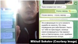 „ბევრი ამბობს ამას, მაგრამ სამწუხაროდ, რაიმე შრომითი ხელშეკრულება ან ის ფურცელი, რომელსაც ხელი მოვაწერე, არ მაქვს“, - ამბობს სოკოლოვი და გვიგზავნის „სკრინშოთებს“, რომლებზეც, მისივე მტკიცებით, ეფესბეს თანამშრომლებთან მიმოწერაა ასახული.