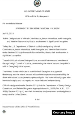 "დღეს, ამერიკის სახელმწიფო დეპარტამენტი ახდენს მიხეილ ჩინჩალაძის, ლევან მურუსიძის, ირაკლი შენგელიას და ვალერიან ცერცვაძის საჯარო სანქცირებას, ვიზის აკრძალვის შესახებ 7031(c) წესის საფუძველზე, მნიშვნელოვან კორუფციულ საქმიანობაში მათი ჩართულობის გამო.