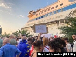 ბათუმის პორტში მოქალაქეები სტვენითა და შეძახილებით აცილებენ სოჭიდან თურქეთის გავლით შესულ საკრუიზო ლაინერს, რომელმაც კურორტზე ტურისტები ერთი დღით ჩაიყვანა. ათობით ადამიანი ახლა ელოდება, როდის დატოვებს ბათუმს პალაუს დროშის ქვეშ მცურავი გემი ASTORIA GRANDE, რომელსაც თურქული საკრუიზო კომპანია Miray Cruises International-ი ემსახურება.