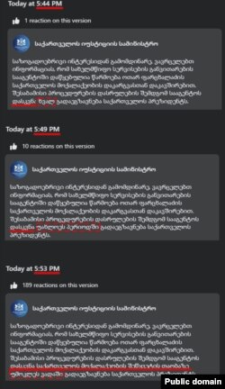 ფეისბუკის პოსტის ისტორიის მიხედვით, თავდაპირველად ტექსტში ეწერა, რომ დასკვნა პრეზიდენტთან ჯერ "ხვალ", შემდეგ - უახლოეს პერიოდში გადაიგზავნებოდა. რედაქტირებულ ვერსიაშია ასევე დამატებული, რომ დასკვნა იქნება "მოქალაქეობის შეწყვეტის" თაობაზე*.