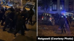 პოლიციის ამ თანამშრომლებს ზურგჩანთები ჰკიდიათ, შავებში არიან გამოწყობილი და ნიღბები და ჩაფხუტები უკეთიათ.