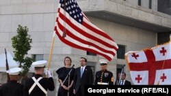 ცოტა ხანში აუდიტორიის წინაშე აშშ-ის ელჩი საქართველოში ჯონ ბასიც წარდგება. მის მისალოც სიტყვას ჯერ ამერიკის და შემდეგ საქართველოს ჰიმნი უძღვის წინ.