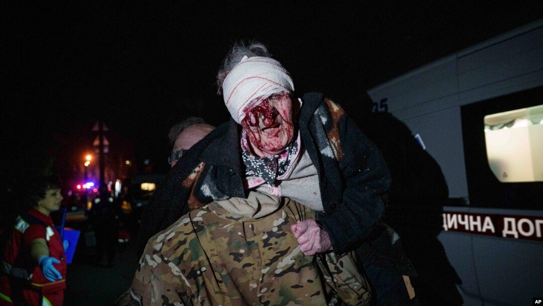 უკრაინელ სამხედროს გადაჰყავს დაშავებული ქალი, რომელიც სახლის ნანგრევებიდან ამოიყვანეს რუსეთის საჰაერო თავდასხმის შემდეგ, კიევის საცხოვრებელ უბანში. 24 აპრილი, 2025.